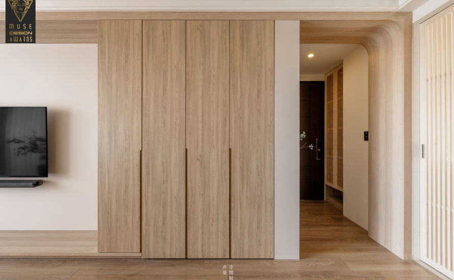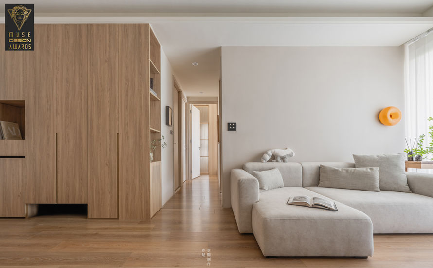 本案為中古屋全室設計案,屋主期望擁有一處「安靜、柔和、自然且好收納」的生活空間。我們以日式侘寂感為靈感基底,透過大量淺木質調、溫潤白牆與弧形語彙,打造出溫和且不失層次的空間節奏。
